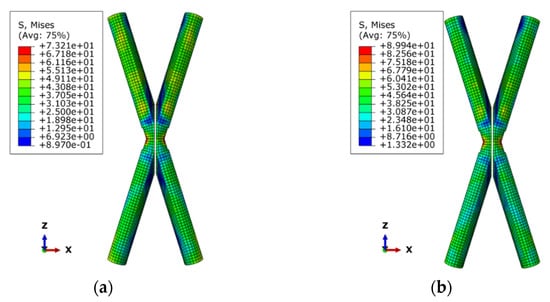 Local von Mises stress diagram of oblique angle specimen: (a) oblique angle is 35°, (b) oblique angle is 50°, (c) oblique angle is 70°, and (d) oblique angle is 90°.