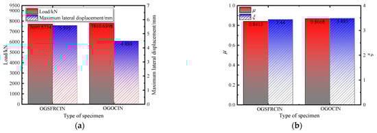 where generally takes the displacement corresponding to the peak load when the load drops to 0.85 times the peak load, but since the bearing capacity of most specimens does not drop to 0.85 times the peak load, the ultimate displacement is taken and is the displacement corresponding to the peak load. In order to directly reflect the mutual compensation between steel pipe and recycled concrete, is introduced as the strength improvement coefficient [], as shown in Equation (18).