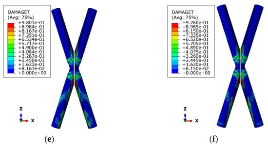 Cloud chart comparison of oblique grid nodes members of different concrete categories: (a) von Mises stress of OGSFRCIN, (b) von Mises stress of OGOCIN, (c) DAMAGEC of OGSFRCIN, (d) DAMAGEC of OGOCIN, (e) DAMAGET of OGSFRCIN, and (f) DAMAGET of OGOCIN.