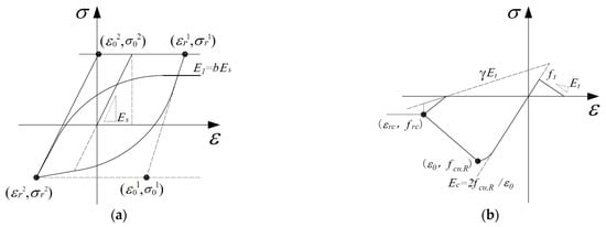 (a) Steel hysteretic constitutive and (b) concrete hysteretic constitutive. Note: σr and εr are the stress–strain at the reverse point, σ0 and ε0 are the stress–strain at the intersection of two asymptotes, and Es, E1, and b are the elastic modulus, plastic modulus, and hardening coefficient of steel, respectively. γ is the hysteretic characteristic parameter, Et is the unloading stiffness of the tensile section, ft is the tensile strength of the concrete axis, εrc is the ultimate compressive strain of concrete-filled steel tube, frc is the ultimate compressive stress of concrete-filled steel tube, ε0 is the peak strain corresponding to the compressive strength of the recycled concrete axis, and fcu,R is the compressive strength of the recycled concrete axis.