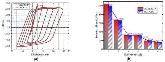Figure 23 shows the comparison of the seismic performance of the two types of members. It can be seen from Figure 23a that the hysteretic curves of the two types of members are close to coincide and have similar evolution rules, and the hysteretic curves have a high degree of fullness, indicating that the two types of members have better energy dissipation capacity. The hysteretic curves of both are asymmetrical because the load in axial compression is jointly borne by steel pipe and concrete, while the load in axial tension is mainly borne by steel pipe, and the tensile capacity of concrete is negligible. OGSFRCIN have a higher initial stiffness than OGOCIN, but the difference is small, as shown in Figure 23b. However, the stiffness decreases rapidly in the later cycle, indicating that the latter has better ductility. In conclusion, OGSFRCIN also has good mechanical properties and rules similar to OGOCIN, which can be applied in engineering practice.