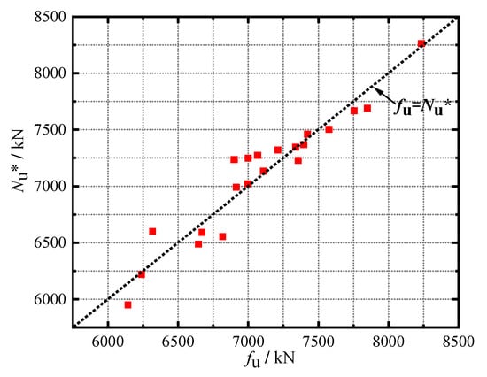 Because Equation (25) is only applicable to common concrete oblique grid nodes, the constraint effect of the lining board is not considered (r1 in Equation (23) in the literature [] is the inner diameter of the steel pipe, etc., and the thickness of the lining plate is not considered.).Therefore, SPSS data analysis software was used to fit and modify the formula based on the ultimate bearing capacity data in Table 4. The result is shown in Equation (26):
