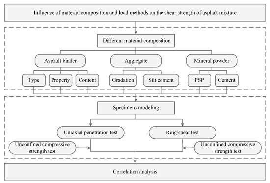 Overall, the previous research found that the uniaxial penetration and circle shear tests both can effectively figure out the shear performance of asphalt mixtures. Therefore, the two test methods mentioned above were both selected to evaluate the influencing factors of the shear performance of asphalt mixtures. Different types, properties, and contents of asphalt binder were adopted to study the influence of asphalt binder on the shear performance of the mixtures. Aggregates containing silt and different gradations of asphalt mixture were chosen to evaluate the impacts of the aggregates used in asphalt mixtures on the shear strength of the mixtures. Cement and PSP replacing minerals were also selected to investigate the improvement in the shear performance of mixtures. The specific research plan was as Figure 1.