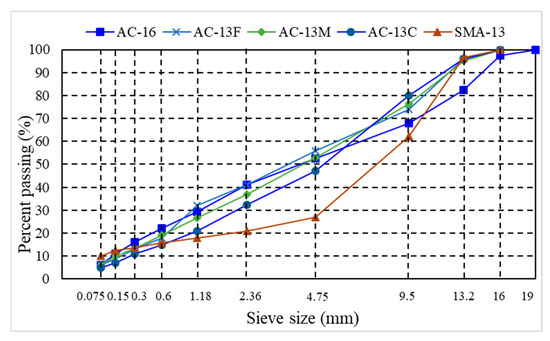 In order to explore the impact of different gradations on the shear performance of mixtures, mixtures with five different gradations of AC-13F, AC-13M, AC-13C, SMA-13, and AC-16 were evaluated. The five different gradations are shown in Figure 2.