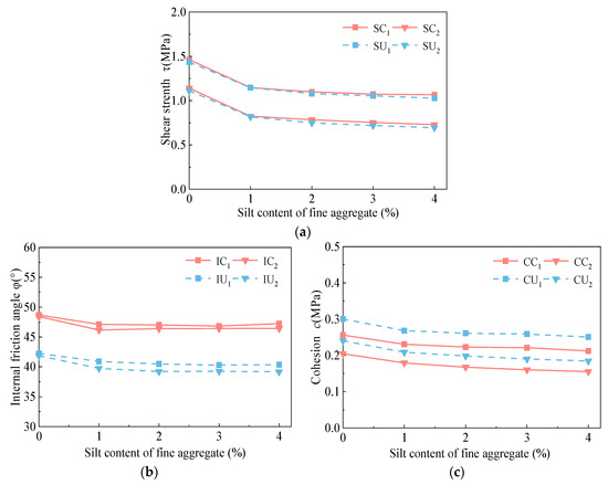 Figure 11 showed that the silt content of fine aggregate greatly influenced the shear strength and cohesion of mixtures, but its internal friction angle was not affected much. Figure 11a shows that the changing trend of shear strength before and after the high-temperature immersion Marshall test both dropped as the silt content increased. The shear strength had the highest value when the silt content was 0%, which was 1.463 MPa for the circle shear test and 1.435 MPa for the uniaxial penetration test. Moreover, the result showed that when the silt content in fine aggregate increased to 1%, it had a drop of over 20% in internal friction angle, cohesion, and shear strength, which indicated that a small amount of silt content in fine aggregate significant reduced the shear performance when compared to those without silt. This is because the cohesion of mixtures is primarily provided by asphalt mortar, and the silt content of fine aggregate seriously affects the adhesion of asphalt mortar, causing a decrease in asphalt mixture shear strength.