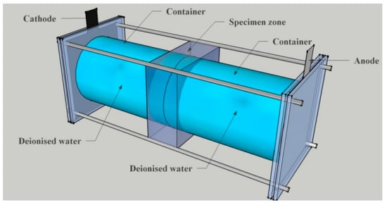 Specific procedures of electrochemical accelerating leaching method (EALM) and measurement method for electrical resistivity were given in previous studies [30]. Three-dimensional structural configuration of electrochemical accelerated leaching device was given in Figure 1. It is noted that in this study, the applied voltage on the plastic concrete is 60 V and the leaching duration lasts for two weeks. De-ionized water should be renewed after leaching for 7 days to investigate the short-term calcium dissolution behavior of plastic concrete. The related parameters include dissolution calcium ions amount, pH value, and electrical resistivity. Dissolution of calcium ions and pH value were tested by calcium ion selective electrode and pH electrode, respectively. Electrochemical impedance spectrum was used to obtain electrical resistivity of bulk materials.