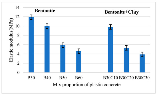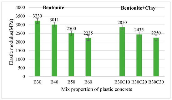 Figure 3 depicts the elastic modulus of plastic concrete mixed with different amount s of bentonite and clay. As Figure 3 shows, the elastic modulus of plastic concrete decreased with the increase in bentonite mixing content. However, the corresponding elastic modulus of B30 and B40 are 3230 Mpa and 3011 Mpa, a little more than the technical index of the experiment. When the mixing content of bentonite increased to 60%, the elastic modulus decreased to 2235 Mpa, by 31% compared with B30. This is mainly due to the plasticity of bentonite. As for the bentonite–clay plastic concrete system, a similar trend of elastic modulus was indicated because the transformation ability of plastic concrete was controlled by fine particles of bentonite and clay dispersing in the cement paste. Consequently, adjusting the mixing amount of soil materials can obtain the appropriate elastic modulus in practical engineering. What is more, the elastic modulus of plastic concrete with bentonite and clay meets the requirements for cut-off walls in dam projects, usually below 3000 Mpa.