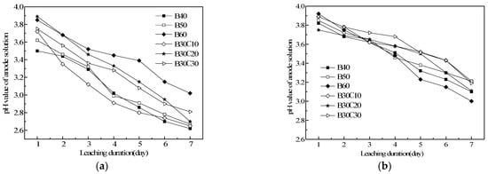 Figure 4 shows the variation in the pH value of the anode solution along with the increase in leaching duration. The results indicate the anode solution becomes more acidic and the falling range of pH during the second leaching week is smaller than that during the first one once the accelerating leaching test starts. The growth rate can be directly estimated through the slope of the fitting pH value–time curve. Take B30C20 for example, the slope of the first week and the second week is 0.1907 and 0.1018 with correlation coefficients 0.9975 and 0.9541, respectively. The concentration gradient of Ca2+ between the pore solution and surrounding de-ionized water drives the quick dissolution and decreases slowly, especially after the exchange of the leaching medium which accounts for the smaller descent rate during the second leaching week. The addition of bentonite together with clay into the mix will improve the leaching behavior of plastic concrete which can be concluded from the pH value of cathode solution versus leaching duration. The pH value of the cathode solution for three concrete groups with bentonite and clay is lower than that of concrete ones with only bentonite when the replacement amount of soil materials is the same. After exchanging deionized water, the difference in pH value of the cathode solution between different mixes diminishes.