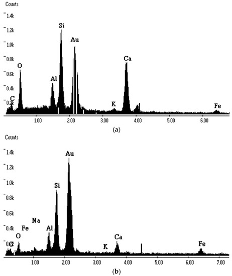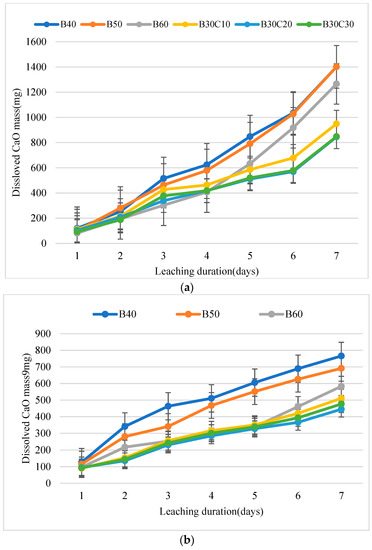 According to the calcium oxide dissolution mass data, great differences between the first week and second week are similar to the pH change trend. Take B40 for example. The CaO dissolution mass at the initial and final leaching test of the first week is 53 mg/L and 620 mg/L while the counterpart value is 56 mg/L and 339 mg/L. The sharp increase in Ca ions in the cathode solution in the first week is attributed to the direct calcium migration from the pore solution to the surrounding de-ionized water and then after renewing the leaching medium, more Ca ions are needed to maintain balance in the pore solution [11,12]. In that case, hydration products mainly include calcium hydroxide and C-S-H dissolved to provide extra calcium ions which leads to descending range of calcium oxide dissolution mass. The calcium oxide dissolution mass decreased with the increase in mixing amount of bentonite, and the same is true for the change trend of bentonite–clay plastic concrete with fixed bentonite and increasing clay. Incorporating bentonite together with clay can effectively improve the leaching resistance of plastic concrete and when the percentage of placement cement by soil materials is the same, the dissolved calcium oxide mass of B30C10 and B30C20 decreased by more than 30% (L7d: 33.3%, 39.3%; L14d: 33.3%, 35.6%).