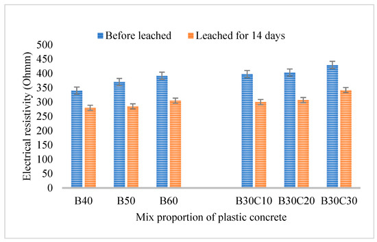 The electrical resistivity of bulk concrete has a close relationship with its intrinsic properties, such as porosity distribution, ion penetration resistance, homogeneous state, cracks, and compaction rate. From Figure 7, we can conclude that the electrical resistivity of all specimens decreased within a small range, mainly due to the short-term leaching duration which proves indirectly calcium dissolution leads to a change in structures. The fine particles of soil materials incorporated into plastic concrete make their structure denser [32], with less porosity and good impermeability, so leached plastic concrete with different mixes after 14 days has little difference in the electrical resistivity. In addition, the addition of bentonite and clay into the mixes of plastic concrete makes them structural compactness and therefore their electrical resistivity is relatively close.