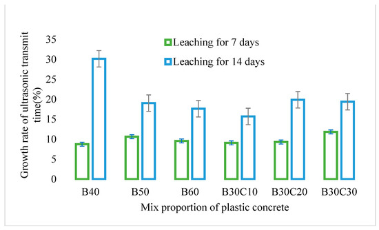 The ultrasonic wave spreads quickly through dense structures of plastic concrete with a corresponding shorter ultrasonic transmit time. Internal micro-pores or cracks due to calcium dissolution inevitably extend the propagation path and increase the ultrasonic transmit time. Figure 8 shows the effect of leaching duration on ultrasonic transmit time through plastic concrete. The 14-day growth rate of ultrasonic transmit time is obviously larger than that of the 7-day value, which indicates that calcium leaching from the concrete matrix is a continuous and time-consuming process. The variation trend of ultrasonic transmit time is in accordance with that of the calcium oxide dissolution mass. Take B40 for example, the cumulative calcium oxide dissolution mass reached up to 2167 mg and the largest growth rate of ultrasonic transmit time increased by 30% after the total leaching test. The increscent ultrasonic transmit time clarifies the degradation caused by the electrochemical accelerating leaching process.