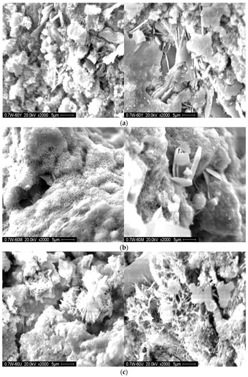 Relative permeability coefficients of plastic concrete mixed with bentonite show great differences from that of bentonite–clay plastic concrete, as Table 7 shows. The anti-permeability decreased with the increase in soil materials for both bentonite plastic concrete and bentonite–clay. However, the relative permeability coefficient of all specimens meets the requirement of design, less than 1 × 10−7 cm/s. Plastic concrete with less cement consumption and low density still has good anti-permeability mainly due to the following three reasons. Firstly, the layer structure of clay mineral compositions bears strong water absorption ability, and its volume will expand 30 times in a water-saturated state, making adjacent components squeeze each other. Secondly, fine particles of bentonite and clay fill most of the interspaces between cement particles and their hydration products, forming a volume filler effect and compact structure. Lastly, the newly generated hydration products, such as C-S-H and CnAHn, after incorporating bentonite and clay, acting as physical and chemical effects, compact the structure and improve its permeability resistance.