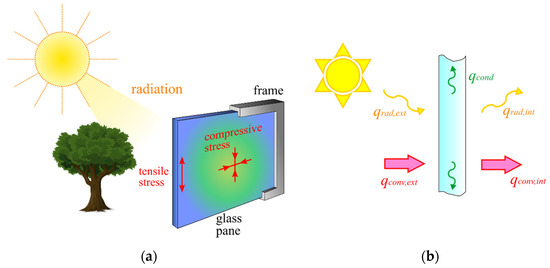 The “climatic actions” related to solar radiation and heat exchange with the environment [5,6] can produce an uneven temperature distribution in glazing panels, enhanced by the presence of shadows, as well as heat sources such as radiators, hot air outlets, etc. Both the technical literature and practical experience provide a wealth of evidence that the strain and stress state produced by these temperature differences can lead to failures.