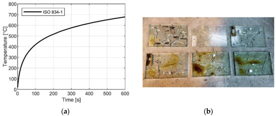 (a) Conventional time–temperature curve according to ISO 834-1 [69] and (b) example of non-uniform thermal exposure (after test; figure reproduced from [70] under the terms and conditions of CC-BY copyright license agreement).