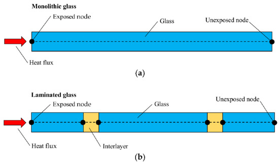 Schematic representation of a reference 1D heat transfer model for (a) monolithic and (b) laminated glass elements (cross-section layout). Figure reproduced from [70] under the terms and conditions of the CC-BY copyright license agreement.