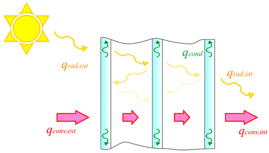 The thermal problem of IGUs must be treated with particular care. Indeed, in addition to the heat exchanges considered in Section 2.1, the heat exchange between the different panes, as well as the gas filling the cavities, must be considered. Two main phenomena have to be considered: