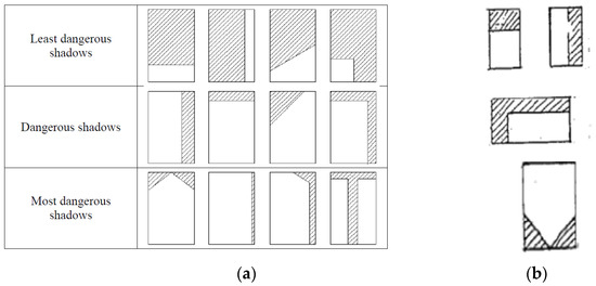 The solar irradiation is also affected by the presence of shadows projected on the glazing due to outside architectural features [9,34,49,50], such as mullion and transom caps, building overhang, trees [51], adjacent buildings, and shading devices. The shading is also influenced by inside parameters [52], i.e., the presence of blinds, proximity of heating appliances, and inside aeration-forcing air system. Static shadows, defined as those present for more than 3 h [53], are more critical than mobile shadows, because the former produce a cooler area of glass [9,54]. Additionally, the shadow shape influences its dangerousness, as discussed in in Section 5.2.1. According to [55], it is usually assumed that the shaded parts of the glazing are hit by a portion equal to 10% of the global solar radiation.