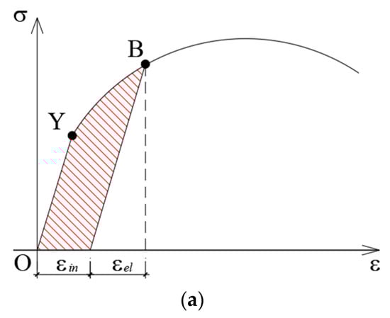 In this paper, the constitutive model of the metallic damper proposed by Soong and Dargush 1997 [] is adopted to predict the inelastic deformation of the energy dissipation device as presented in Figure 1. Figure 1a shows the curve of characteristics for most metals. The response is fully elastic with proportional to ε when the loads corresponding to nominal stress are less than the yield stress . The initial state O, in this range, is fully recoverable when the applied load is removed, and no energy dissipation is there. On the other hand, when the nominal stress exceeds the yield stress, irreversible plastic deformation occurs dissipating energy. Considering the state labeled B, it is useful to partition the total strain at B into elastic () and inelastic () contributions.