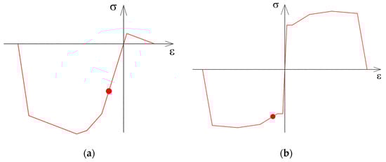 With E representing the elastic modulus. The nonlinear constitutive model accurately describes the practical response of most metals. However, it requires an advanced program for analysis that often takes too excessive computation cost. In this research, the bilinear model is applied with the material hardening law which is used kinematic hardening model proposed by Prager [], details shown in Figure 1b and given by Nakashima [] (where β is the strain–hardening parameter). An upper and lower limit stress of the kinematic hardening bound have absolute values the same and correspond to the maximum stress experienced in the previous loading history []. For other structural components, concrete and steel constitutive models used Takeda and Kinematic hysteresis rules [,], respectively, as shown in Figure 2.