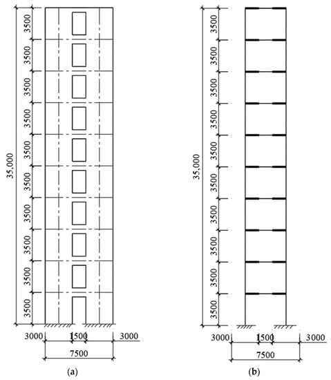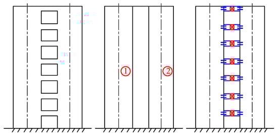 Two types of modeling are considered for reinforced concrete coupled shear wall systems: (1) continuous medium method; (2) analogous frame method []. In the analogous frame model, which is applied in this study, the coupled shear wall consists of flexible columns at wall centroidal axes, flexible beams to represent the coupling beams, and rigid arms located at the connecting beam levels, spanning between the effective column and the external fibers []. This means when modeling the reinforced concrete coupled shear wall structures, the coupling beam consists of two rigid elements and one frame element. Recently, in addition to experimental studies, the coupling beam using the above types of energy dissipation devices is modeled including two rigid elements for the rigid area at the joints of wall piers and beams, coupling beam is modeled like a normal beam element, and zero-length element as dampers [,]. It is clear that the coupling beam model can be divided into 3 or 4 different elements in previous studies, however, the number of elements to be modeled as well as the computational volume is significantly large, especially for high-rise buildings. On the other hand, the purpose of this research is to combine the whole beam into 1 element, even in the case of coupling with or without energy dissipation device.