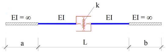 Determination of the stiffness matrix of the beam with rigid zones at ends, whose lengths are a (left) and b (right) as presented in Figure 10, respectively.