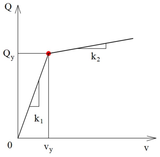 where and are the vectors of incremental load and displacement, respectively; is the stiffness matrix. To solve the static problem, the full load is divided into several incremental steps. The first increment is calculated with k1, then the stiffness matrix is built, and next the load vector is computed. In light of this, the internal force and displacement vectors are calculated. As mentioned in Section 2, the energy dissipation device uses a bilinear model whose characteristic parameters are stiffness k1 and post–yielding stiffness k2 (Figure 11). Therefore, to exactly determine the stiffness at the calculated load step, it is necessary to check the relationship between shear force and displacement of the EDCB element. The calculation is continued if the stiffness k1 is still satisfied otherwise the post–yielding stiffness k2 will be used for the next step. The accuracy of the problem depends mainly on the value of the incremental load step.