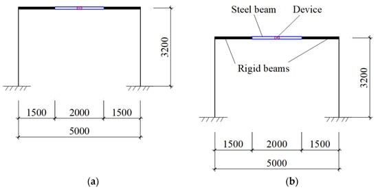 The first example is a one-story frame with the geometry presented in Figure 12a. The columns have a cross-section of using reinforced concrete materials with the elastic modulus and the Poisson’s ratio μ = 0.2. The entire beam including two rigid beams, one steel beam, and an energy dissipation device located in its middle is modeled as the EDCB element. The parameters of the steel beam and device are the steel beam’s material parameters: elastic modulus ; Poisson’s ratio μ = 0.3; beam cross-section: depth 400 (mm), flange width 250 (mm), flange thickness 12 (mm), and web thickness 10 (mm); and the device’s parameters , , [] (Figure 11). Dead and live loads imposed on the floor are, respectively, 9.7 (kN/m2) and 2.0 (kN/m2). The beam in SAP2000 software is composed of 4 elements: 2 absolutely rigid beam elements, 1 steel beam element, and 1 device model element (MultiLinear Plastic link element) (Figure 12b) [,].