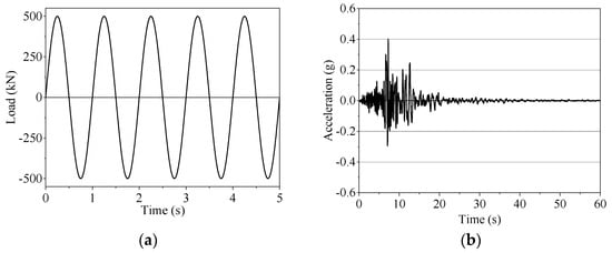 Loads: (a) Harmonic load P(t); (b) Earthquake record CAST360_DBE.