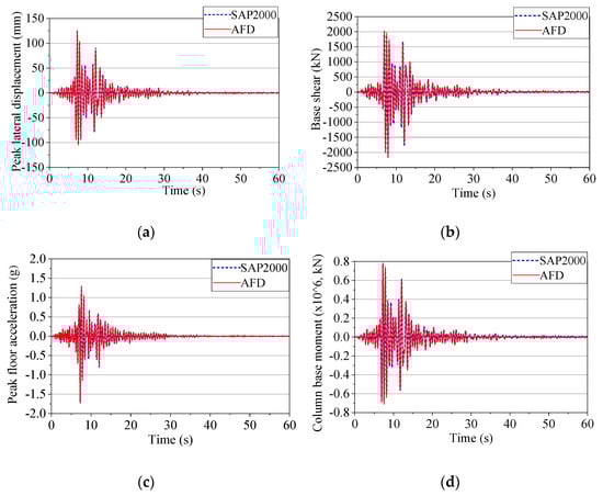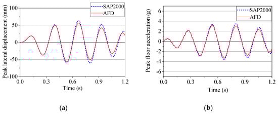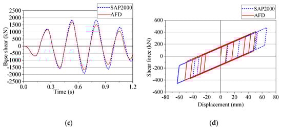 A frame survey is conducted under the case of harmonic load P(t) placed at the top of the building with a sine wave having the largest amplitude of 500 (kN) in two case: (1) the harmonic load P(t) with the period of sine wave of 1.0 (s) (Figure 13a) and (2) the period of sine wave of 0.2485 (s), which is the same with the fundamental vibration period of the 1st mode of the 1-story frame. Figure 14 and Figure 15 show the results of peak lateral displacement, peak floor acceleration, base shear, the shear force-displacement relationship of the device under harmonic load, comparison between the AFD program and SAP2000 software in two cases. Based on the outcomes, it can be seen that the results achieved using AFD agree well with those of SAP2000.