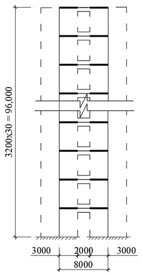 To evaluate the effectiveness of using an energy dissipation device in coupled shear wall structures, this section will carry out an analysis of a 30-story coupled shear wall structure with an energy dissipation device in a coupling beam under earthquake loading as presented in Figure 19. In this case study, the proposed EDCB element and program AFD are used. The parameters of the energy dissipation device and earthquake record are the same as the 10-story analysis. The height of the 30-story building is 96 (m) with a story height of 3.2 (m). Concrete with elastic modulus is used for reinforced concrete shear walls. The thickness of the studied reinforced concrete shear walls varied along with stories: 700 (mm) for 1st and 2nd stories, 600 (mm) for 3rd to 8th stories, 500 (mm) for 9th to 12th stories, 400 (mm) for 13th to 16th stories, and 300 (mm) for remaining stories. A steel beam has material parameters: elastic modulus ; Poisson’s ratio μ = 0.3; cross-section of I-beam without energy dissipation device: depth of 700 (mm), flange width of 250 (mm), flange thickness of 12 (mm), and web thickness of 10 (mm). Steel box beam is used for beam has energy dissipation device with a depth of 700 (mm), a width of 250 (mm), and a thickness of 8 (mm). The study surveyed three cases: 1 device, 10 devices, and 30 devices added in coupled shear walls. With the same data of energy dissipation device as above, the purpose of the survey is to find out the effective device placement for the building under the impact of earthquakes.