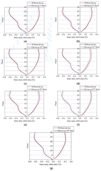Inter-story drift ratio of structure when one device assigned at: (a) 1st floor; (b) 5th floor; (c) 10th floor; (d) 15th floor; (e) 20th floor; (f) 25th floor; (g) 30th floor.