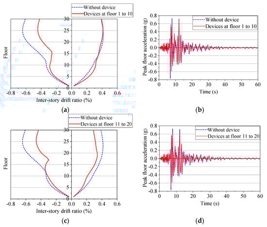 Behavior of structures: (a) Inter-story drift and (b) Floor acceleration on 30th floor: devices on floors 1 to 10; (c) Inter-story drift and (d) Floor acceleration on 30th floor: devices on floors 11 to 20.