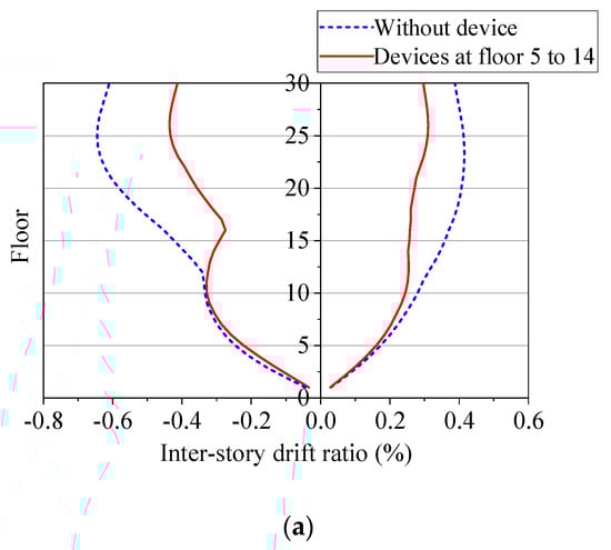 The inter-story drift ratio is an important index, which can reflect the damage to the structural components. Based on the results from Figure 20, it can be seen that when the building has only one energy dissipation device, the inter-story drift ratio does not change much compared with when the coupled shear wall is without the device, except for the case when the device is used at 15th floor. Figure 20d shows the maximum inter-story drift is reduced by 11.3 (%) from 0.415 (%) to 0.373 (%) corresponding to the case without and with the device added on the 15th floor.
