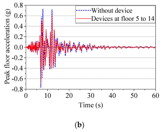 Devices on floors 5 to 14: (a) Inter-story drift ratio; (b) Floor acceleration at 30th floor.