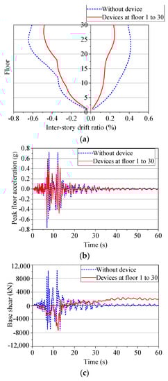 Devices at floors 1 to 30: (a) Inter-story drift; (b) Floor acceleration at 30th floor; (c) Base shear.