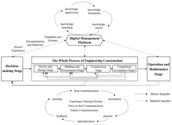 Engineering consulting service is a high-end intelligent service based on knowledge []. The implementation of the engineering consulting project is the process of integrating and applying knowledge in organization, management, economy, technology, and other related aspects []. Knowledge transfer is involved in the whole life cycle []. Whole-process engineering consulting refers to the intellectual service activity of providing partial or overall solutions involving organization, management, economy, and technology for the whole life cycle of investment decision, construction, and operation of construction projects []. In the knowledge transfer in the engineering consulting project involved in this paper, that is, in the process of engineering project management services and professional consulting services, all information such as data, documents, and communication information of each project stage and business are continuously transferred, accumulated, absorbed, and applied with the project construction process []. Based on the situation of the whole-process engineering consulting and the demand for digital development, this study proposes the knowledge transfer process of each business stage of the whole-process engineering consulting project with a digital management platform as the core, as shown in Figure 1. A digital management platform, as an important medium for knowledge transfer and an effective tool for the indirect transfer of project knowledge [,], can provide experiential learning opportunities and a platform for exchanges with experts for the participating units and project members in each business stage of the project. Multiple cycles of project knowledge utilization and innovation can be realized through knowledge search, knowledge matching, knowledge absorption, knowledge application, and knowledge feedback. For the tacit knowledge that is difficult to be expressed and disseminated or that requires in-depth communication and explanation to realize knowledge transfer and absorption, such as technical experience, construction techniques under specific situations, and technical processing methods, direct knowledge transfer is realized through experience-sharing sessions, face-to-face communication, online communication, and other channels to promote project members to acquire and absorb knowledge through learning, in-depth communication, perception, practice, internalization, and feedback.