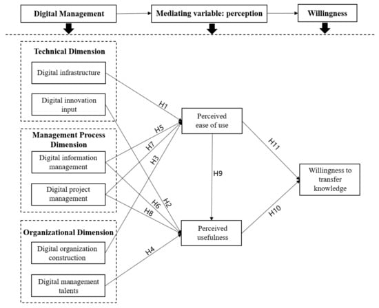 Based on the theoretical framework of TAM and the above research hypothesis analysis, it was investigated how digital management affects the willingness to transfer knowledge through the variables at the perception level and, thus, construct a theoretical model of the impact of digital management on the willingness to transfer knowledge, as shown in Figure 3.