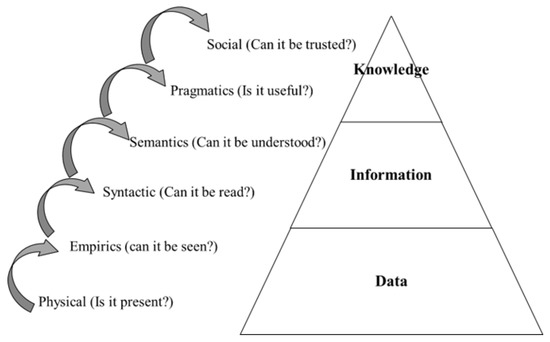 Kahn et al. [67] addressed the relationships between semiotic levels, the data-information-knowledge (DIK) hierarchy, and associated data-quality issues, as shown in Figure 2. The relationship between semiotic levels and structure, data, information, and knowledge facilitate the identification of unique data quality issues that may necessitate the application of specialised skills to resolve. Knoke and Yang [68] claimed that information originates with data and is transferred to knowledge in the DIK hierarchy. Depending on how data’s meaning, structure, and operation are communicated at different semiotic levels of the DIK hierarchy, such transference could increase or decrease data’s meaningfulness, transferability, and applicability.