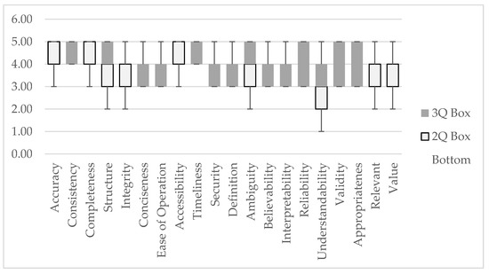 Figure 3 shows the box-and-whiskers plot of the data quality dimensions for assessing overall highway project data quality. It shows that the range of most of the dimensions is between 3 and 5, i.e., the responses from the decision-makers range from somehow important to high importance. Based on the data, it seems that accuracy, completeness, and accessibility are considered to be the most critical dimensions of data quality by more than half of the decision-makers, as they have the highest median value of 5. The dimensions consistency, structure, integrity, timeliness, ambiguity, relevant, and value also have a relatively high median value of 4, indicating that they are still considered essential by many decision-makers. On the other hand, dimensions such as conciseness, ease of operations, security, definition, believability, understandability, validity, and appropriateness have a median value of 3, indicating that they are considered less critical by decision-makers. It is important to note that these findings are based on decision-makers’ responses and reflect the objective of data quality measures. Nonetheless, they provide valuable insights into the perceived importance of different dimensions of data quality in the context of highway project data.