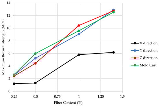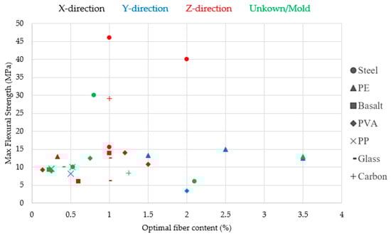 - Based on studies about the incorporation of fibers in 3DPC, the alignment of force in the z-direction was perpendicular to the fibers; consequently, the flexural strength was improved by adding the fibers.