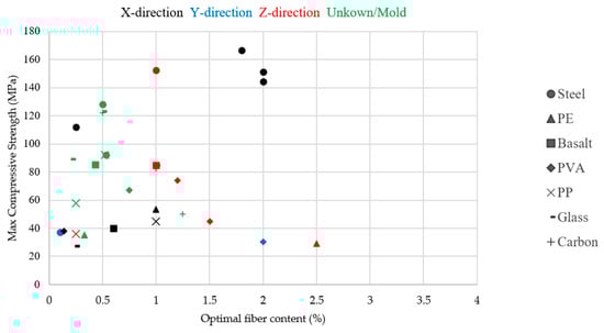 | Steel | 6 mm | 3DPUHPFRC | 65 | y-direction | 2.5, 3.5 and 4 vol.% (hybrid with basalt fibers) | 4 vol.% (hybrid) | 42 | z-direction | 4 vol.% (hybrid) | 122 | z-direction | Micro structure analyses | [96] | |