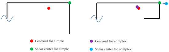 Cold-formed steel (CFS) is widely used in many countries in structural and non-structural members due to its high strength-to-weight ratio and low cost of material and manufacture [1]. Buckling refers to a type of structural failure where a compressed member, such as a cold-formed steel section, suddenly bends or collapses under an applied load. As thin-walled sections become increasingly complex, the issue of buckling becomes more serious. An edge stiffener is a structural component that is attached to the edge of a thin-walled steel element to provide additional support and improve its stability. The edge stiffener width−thickness ratio and the edge stiffeners’ form strongly influence the element’s buckling performance and can even affect its buckling mode [2]. If the edge stiffeners of open cross-section thin-walled steel elements do not have folds, they will have poor local stability. Simple edge stiffeners consisting of a single lip at the free edge provide substantial benefits, but when the lip becomes too long, it may buckle first and cause instability. To improve the elements’ stability, the edge stiffeners must be stiffened moderately. Hence, thin-walled steel elements with complex edge stiffeners have emerged, which can alleviate this instability by providing additional folds to the lip itself [3]. As shown in Figure 1, the shear center will be far away from the flange−stiffener juncture when the simple edge stiffeners are folded inward. As the distortional buckling mainly occurs near the flange−stiffener juncture, multiple folds can improve the ultimate bearing capacity of the element [4]. Therefore, an improvement of the stiffening form at the edge stiffeners is a vital way to limit the buckling of flanges and enhance the mechanical properties of the section.