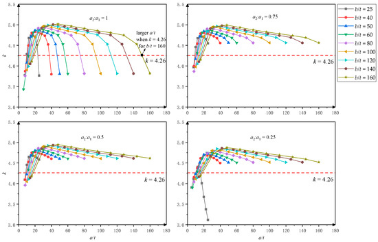 The complex edge stiffener form is divided into four types, as shown in Figure 7, for parametric analysis. Based on the FSM, the relationship between l/t and a/t is obtained as shown in Figure 8. Referring to Equation (1), the relationship between k and a/t is obtained as shown in Figure 9.
