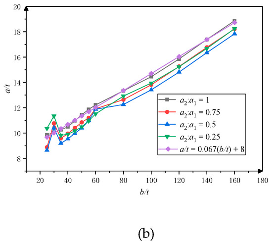 As shown in Figure 10a, the constraint effects of complex edge stiffeners under a2:a1 = 1, a2:a1 = 0.75, and a2:a1 = 0.5 are obviously better than that of a2:a1 = 0.25. The constraint effect is worse and should be avoided when a2:a1 = 0.25. Therefore, it is considered that the ratio of the primary edge to the secondary edge should not be greater than 2. The relationship between a/t and b/t is linear according to l/t = b/t, and the minimum value of the edge stiffener width−thickness ratio in different proportions can be selected according to Equation (5), where a2:a1 ≥ 0.5.