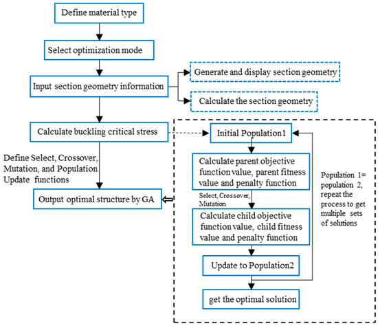 The genetic algorithm (GA) is a random search method based on principles of natural evolution, in which a population of candidate solutions is evolved through special selection rules to optimize the fitness function (optimization target) during the evolution process [31]. In this paper, Python3.9.2 is used to program the section optimization program, the critical buckling stress is calculated by the FSM, and the optimal section is selected by the GA. The program flowchart is shown in Figure 11. According to the characteristics of the problem, the program contains five main files constructed with an object-oriented program: using.py provides the user data input interface and displays the output results; cufsm.py calculates the critical buckling stress of the section based on the FSM; genetics.py realizes the GA optimization design of the provided section, and optimizes the width and its proportion of the edge stiffeners; material.py contains the Material class. This module provides the Material class for the typical steel structure. Its subclasses include Q235 class, Q355 class, Q390 class, etc., which can offer a variety of steel properties and provide the function of customizing materials; section.py completes the definition of the geometric properties of the section.