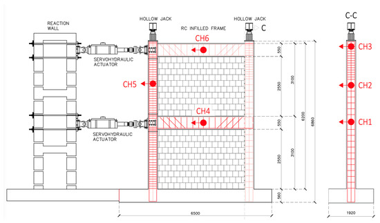 Output-only modal identification tests were performed before and after pseudo-dynamic sequences on full-scale, one-bay, two-storey RC frames with masonry infill walls, as shown in Figure 1. Details about the experimental program and the modal identification are reported in the following paragraphs.