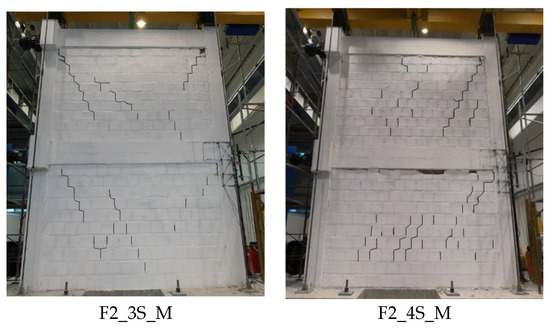 Similarly, in test F2_4S_M, the infill walls’ cracking and crushing are recorded, respectively, at IDR = 0.07% and IDR = 0.40%, which are compatible with the observed damage in 75% AQG and 125% AQG experimental sequences.