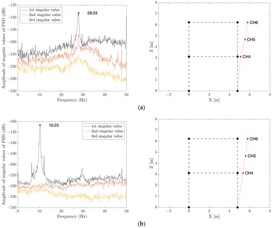 Data acquired through output-only modal identification tests before and after damage were processed using the singular value decomposition of the PSD matrix according to the frequency domain decomposition method [23]. As an example, tests recorded in terms of frequency are plotted in Figure 5 for test F2_4S_M for the in-plane direction before Figure 5a and after damage Figure 5b.