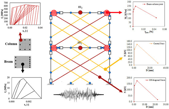 A refined non-linear FE model with distributed plasticity is developed in OpenSees [24] to simulate the seismic performance of tested frames. A schematic summary of the numerical model is reported in Figure 6 where the blue dots represent the nodes created for the model development and the red dots indicate the storey masses, m1 and m2. Figure also reports the adopted constitutive models of each element and material, including the rotational springs for the beam-column joint and the compression-only truss elements for the infill walls. It should be noted that Figure 6 refers to the four-sided configuration. The BeamWithHinges command is used to build forceBeamColumn elements, which allow distributed plasticity to also be spread beyond the plastic hinge region. The solid cross-section of RC elements is uniformly discretised into fibres to closely represent small stress–strain variations. The effect of confinement of concrete mechanical behaviour is neglected due to the low axial load ratio and high transverse reinforcement spacing. The concrete nonlinear behaviour is simulated with the Concrete01 material, while the longitudinal steel reinforcement is modelled with the OpenSees uniaxial Hysteretic material. The parameters adopted for both stress–strain models are calibrated against the experimental data reported in Del Vecchio et al. [20].