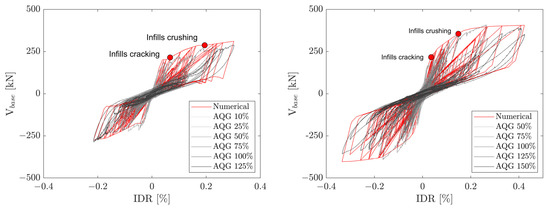 Markers are also reported in Figure 7, representing the achievement of selected damage mechanisms for the infill walls, namely, the infill cracking and crushing. In F2_3S_M, the diagonal cracking and crushing of the first storey infill panel are achieved in the numerical model for IDR = 0.06% and IDR = 0.26%, respectively. These results are in agreement with the experimental damage observed during the 50% and 125% AQG sequences, respectively. No damage to the RC frame is recorded in the FE model, in agreement with the experimental observations.